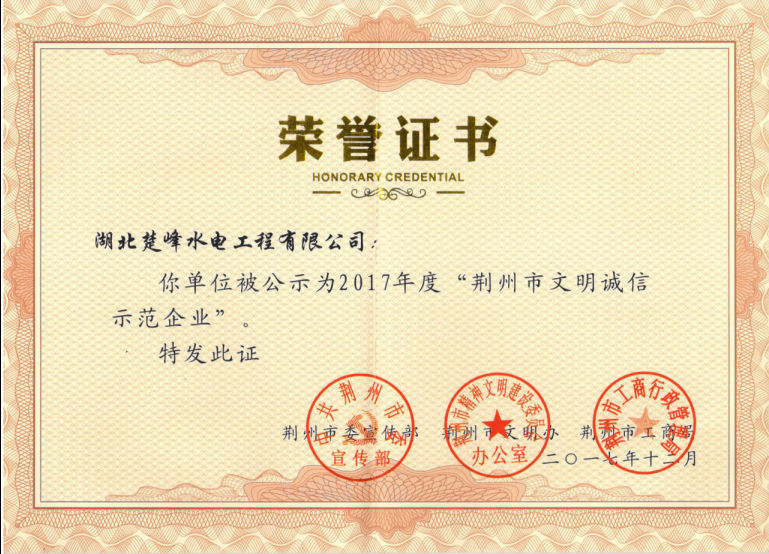 根據《市(shì)委宣傳部、市(shì)文明辦、市(shì)工商(shāng)局關(guān)于公示2017年度荊州市(shì)文明誠信示範企業的通報(bào)》,我被公示為(wèi)2017年度“荊州市(shì)文明誠信示範企業”,并于近日獲發了(le)榮譽證書和匾牌。 開展文明誠信示範企業創建公司活動,是市(shì)委宣傳部、市(shì)文明辦、市(shì)工商(shāng)局根據中央辦公廳《關(guān)于培育和踐行社會主義核心價值觀的意見》和湖北省文明誠信示範企業創建活動的通知要求進行的。我公司對創建活動高度重視(shì),一(yī)抓廣泛宣傳動員(yuán),做到全員(yuán)參與;二抓基層黨建,實現(xiàn)核心隊伍強魂補鈣;三抓文明工地建設,不斷提高科學管理(lǐ)水平和員(yuán)工素養;四抓法治建設、合同管理(lǐ),确保行商(shāng)規範、有約必踐、信守誠義。在創建活動中實現(xiàn)了(le)企業綜合素質的整體(tǐ)提升和經營能(néng)力的成長。 這(zhè)是我公司繼獲得2016年度“荊州市(shì)文明誠信示範企業”後的第二次蟬聯殊榮。