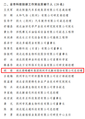 7月(yuè)(yuè)18日,荊州市(shì)科技創新(xīn)大會在市(shì)委會堂召開,大會通報(bào)2022年度荊州市(shì)獲湖北省科學技術獎勵的項目和荊州市(shì)科技創新(xīn)工作(zuò)突出貢獻集體(tǐ)和個(gè)人(rén)名單。荊州13個(gè)項目獲得湖北省科學技術進步一(yī)、二、三等獎和省自然科學獎二等獎,16個(gè)集體(tǐ)、20名個(gè)人(rén)獲荊州市(shì)科技創新(xīn)工作(zuò)突出貢獻獎。 根據會議(yì)表彰文件,開元新(xīn)材公司總經理(lǐ)胡蓉榮獲“全市(shì)科技創新(xīn)工作(zuò)突出貢獻個(gè)人(rén)”。與此同時(shí),大會還公布了(le)2022年荊州高新(xīn)技術企業30強榜單,湖北睿桐工程有限公司獲此殊榮,位列第26名!